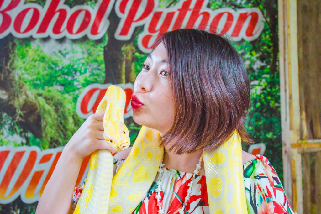 ひんやりとしていて意外とプニプニしている4メートルを超える巨大なヘビ。ボホール島観光の記念に勇気を出して首に巻いてみましょう。よくみたら意外とかわいい?