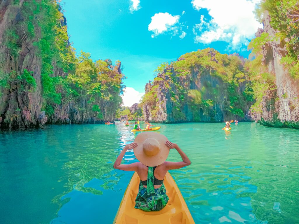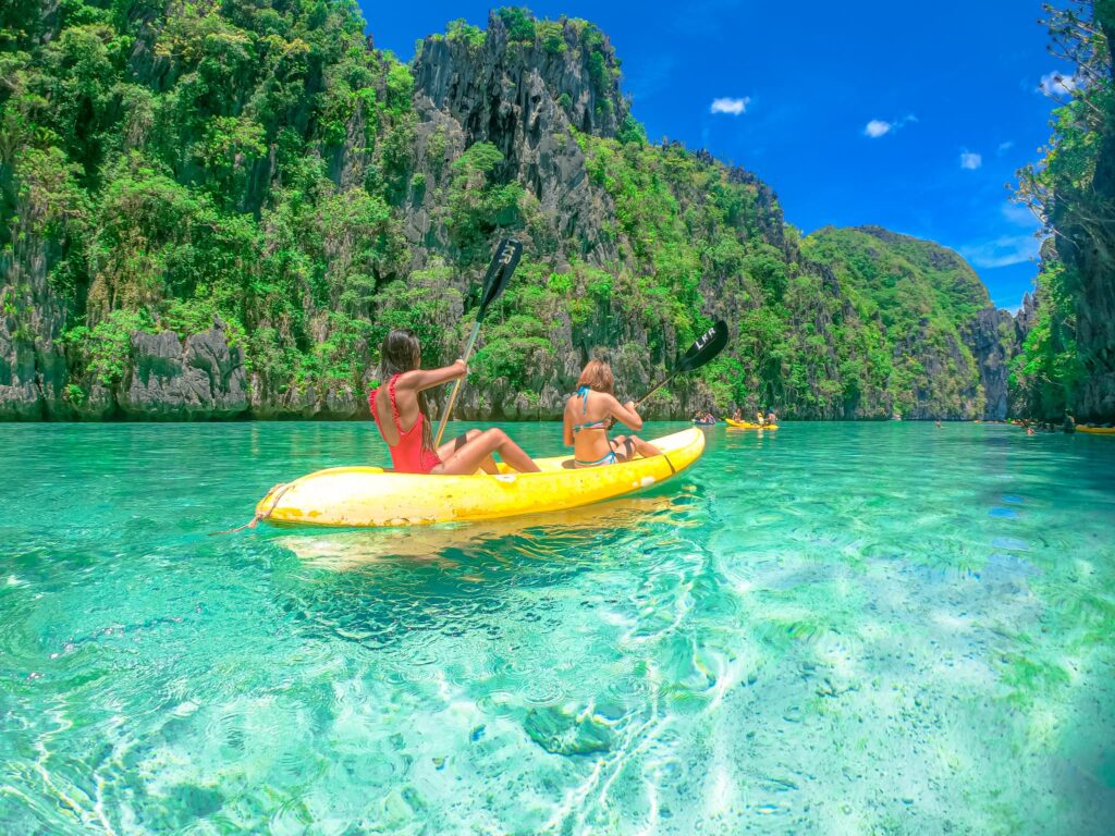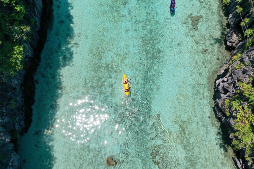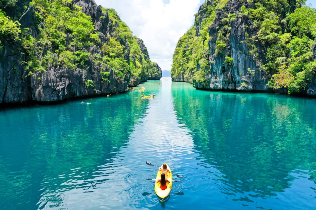 石灰岩の崖に囲まれたラグーンをカヤックで進む体験は、まさにエルニドならではのアクティビティです。透明度の高い海と静かな雰囲気が魅力です。