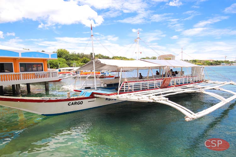 フィリピン伝統式のバンカーボートだ!船の揺れが少ないから、船酔いの心配はいらないよ!