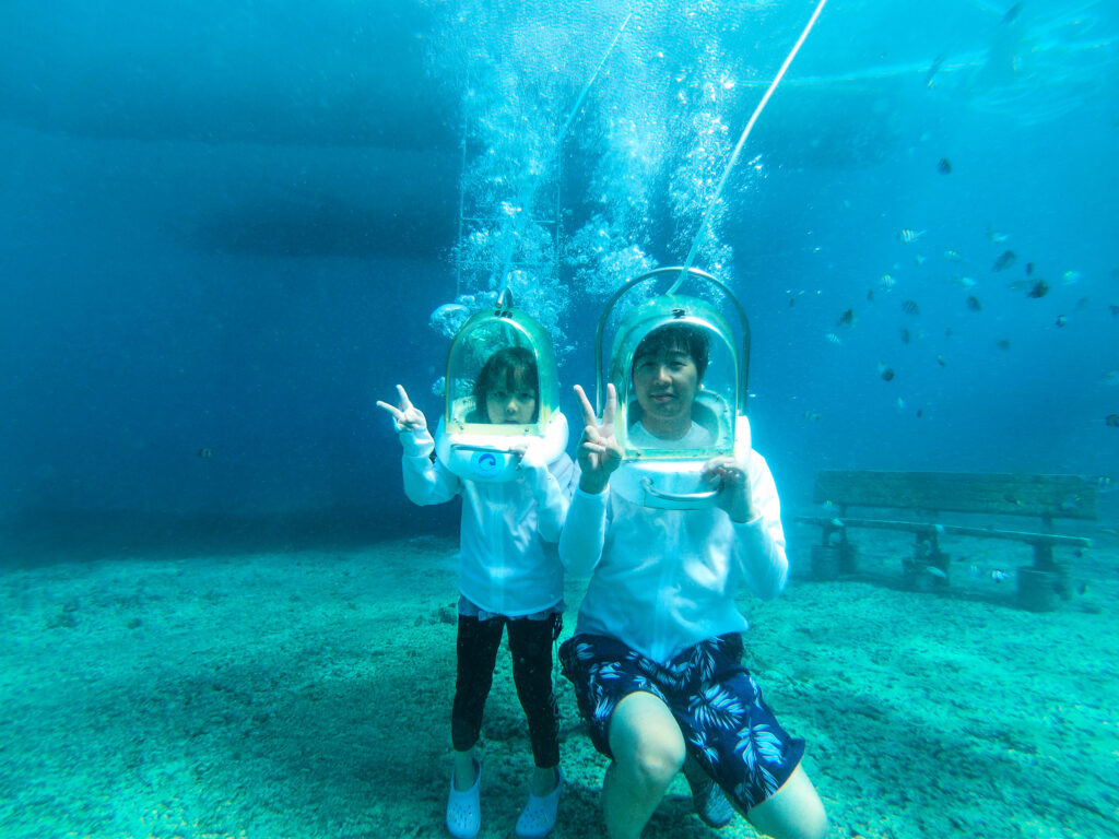 専用ヘルメットをかぶって海底を歩く体験。顔を水につけずに海中の景色を楽しめるため、泳ぎが苦手な子どもでも参加しやすいのが魅力です。手をつなぎながら進めるので、親子で安心して海の世界を満喫できます。