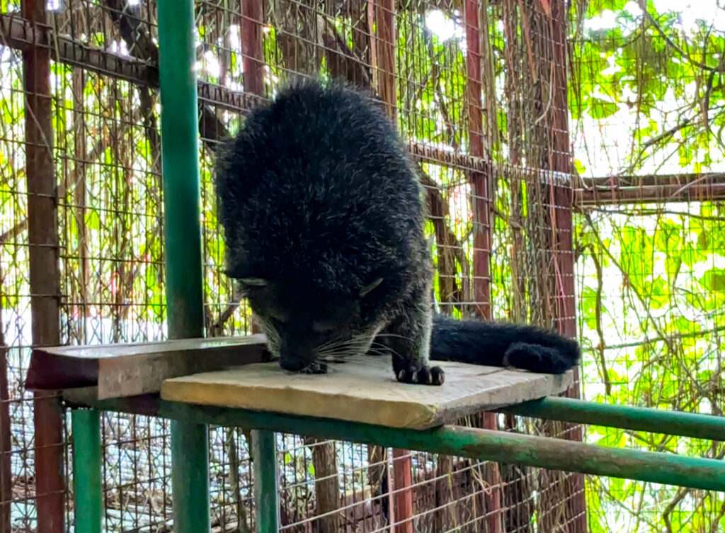 まるで「アライグマの黒バージョン」のような見た目で、ビントロング(Binturong)という珍しい動物でした。
