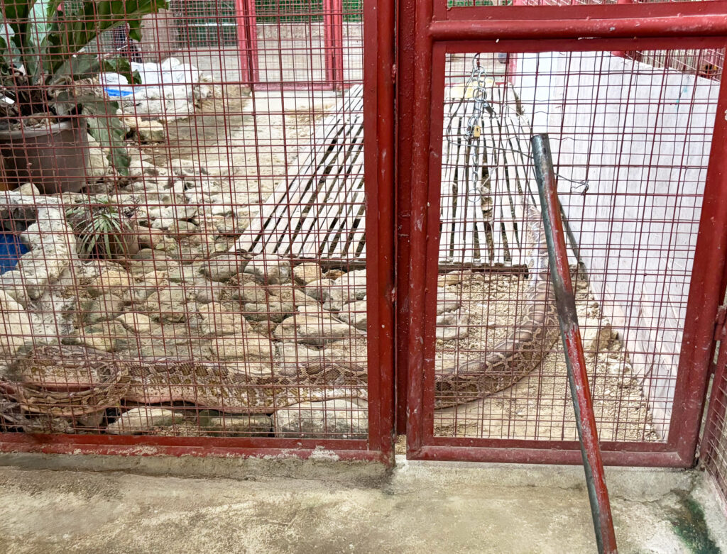 さらに奥のエリアには、少しワイルドな見た目の大蛇も檻の中で飼育されており、
