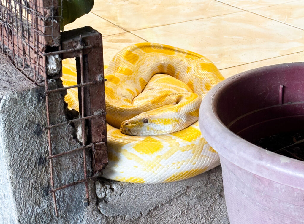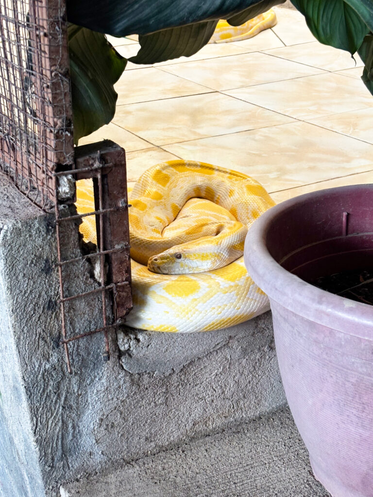 敷地内ではなんと、檻の外で穏やかに過ごす黄色い大蛇が3匹も!😳