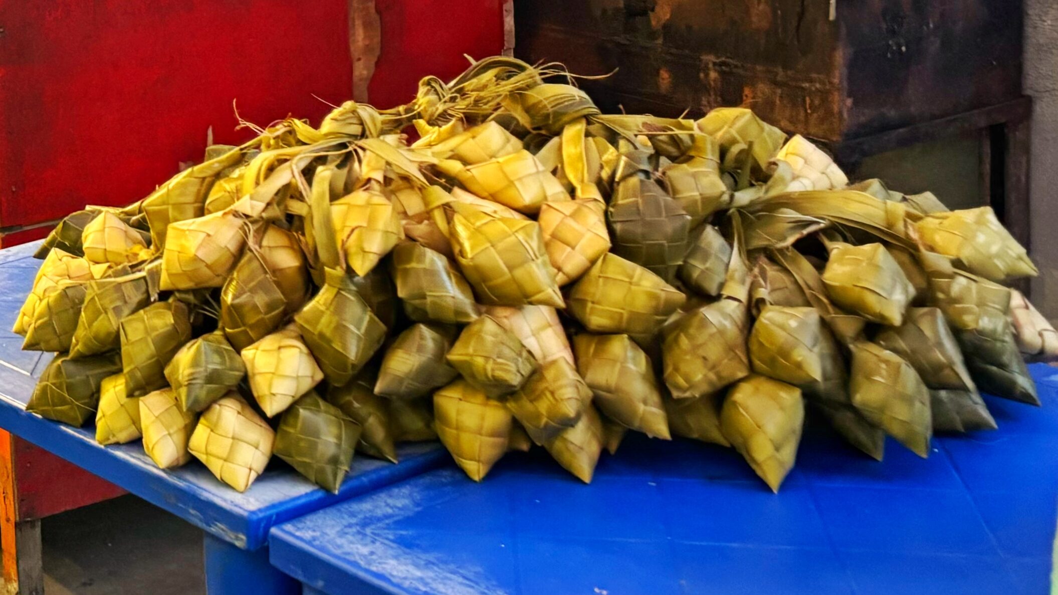 To make it, cooks place rice inside intricately woven coconut or palm leaves shaped like small diamond pouches, then boil them until the grains expand and take the form of the casing.